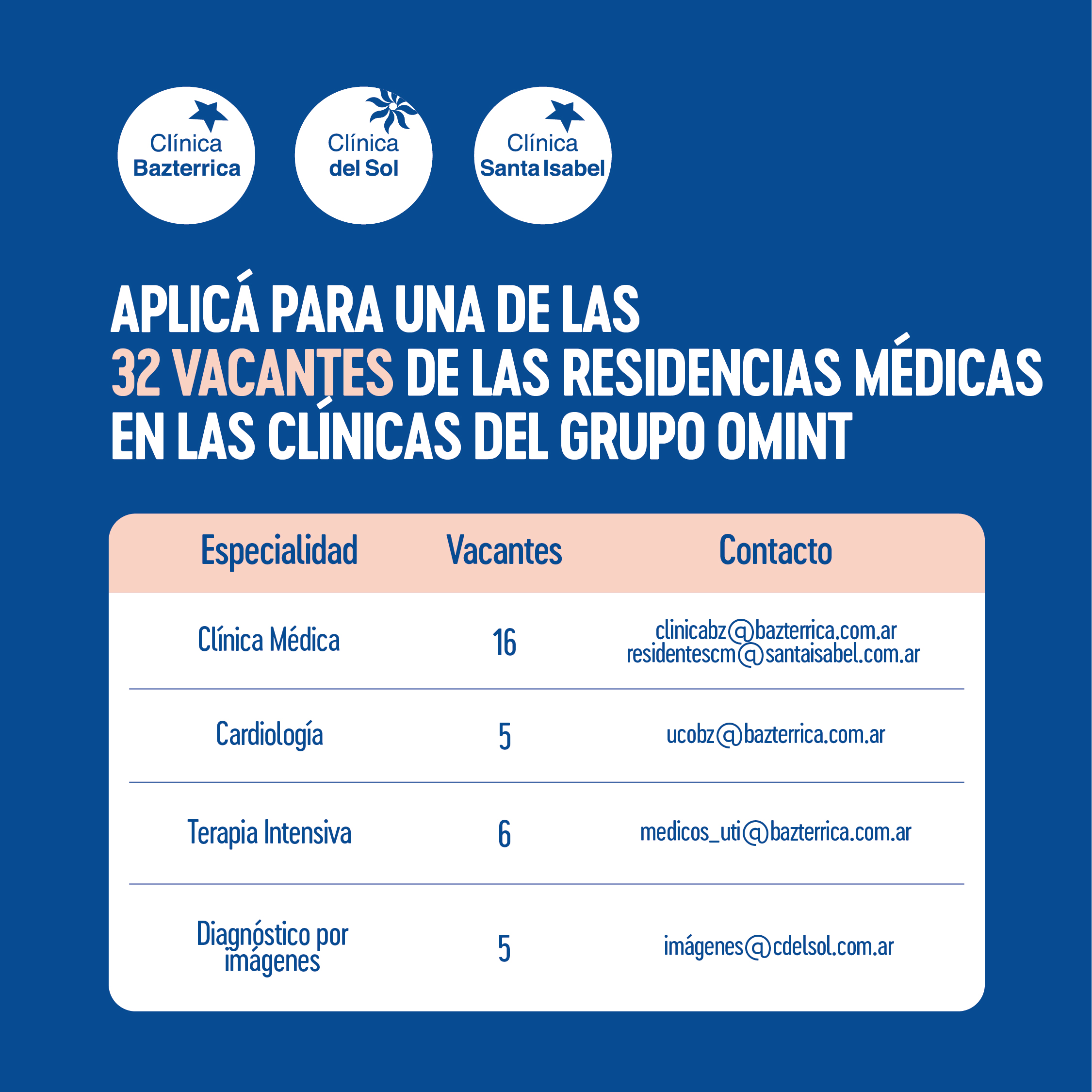 Las reconocidas instituciones del Grupo Omint, Clínica Bazterrica, Clínica Santa Isabel y Clínica del Sol, te invitan a participar en el proceso de selección para las Residencias Médicas 2023 que iniciarán el 1° de Septiembre.