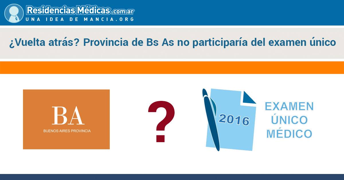 El 20 de noviembre pasado les contamos que, según la página web del Ministerio de Salud de la Nación, el Examen único y el Examen de Provincia de Buenos Aires se fusionaron en uno solo. Sin embargo, actualmente la provincia de Buenos Aires no aparece en la página del Examen único como una de las provincias incluidas en este examen. A su vez, podemos ver que en la página de la Provincia de Buenos Aires aparece la bibliografía provisoria para el examen 2016 como si fuera un examen aparte. Esto indicaría que los exámenes se realizarían en forma separada, como en las ediciones de años anteriores.