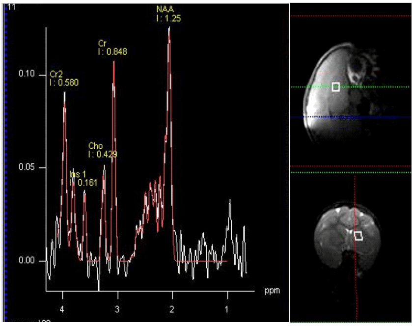 La espectroscopia por MR es ideal para mediciones repetidas y para medir resultados terapéuticos mediante la obtención de señales químicas o metabolitos de una región de interés. Se genera un espectro de picos, por lo que cada pico refleja un producto químico que resuena a una frecuencia específica (descrita en partes por millón o ppm); la altura del pico refleja la concentración de ese químico en el cerebro (descrito como una proporción de creatina, unidades institucionales o concentración milimolar).