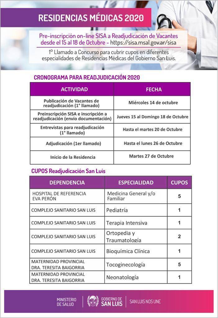 El Gobierno de San Luis, a través del Ministerio de Salud, convoca a los profesionales a realizar la preinscripción de readjudicación de cargos vacantes para residencias en distintas especialidades, podrán realizarlo a través de la página nacional de SISA ( Sistema Integral de Información Sanitaria Argentino) http://www.sisa.msal.gov.ar/ , entre los días 15 y 18 de octubre del corriente año.